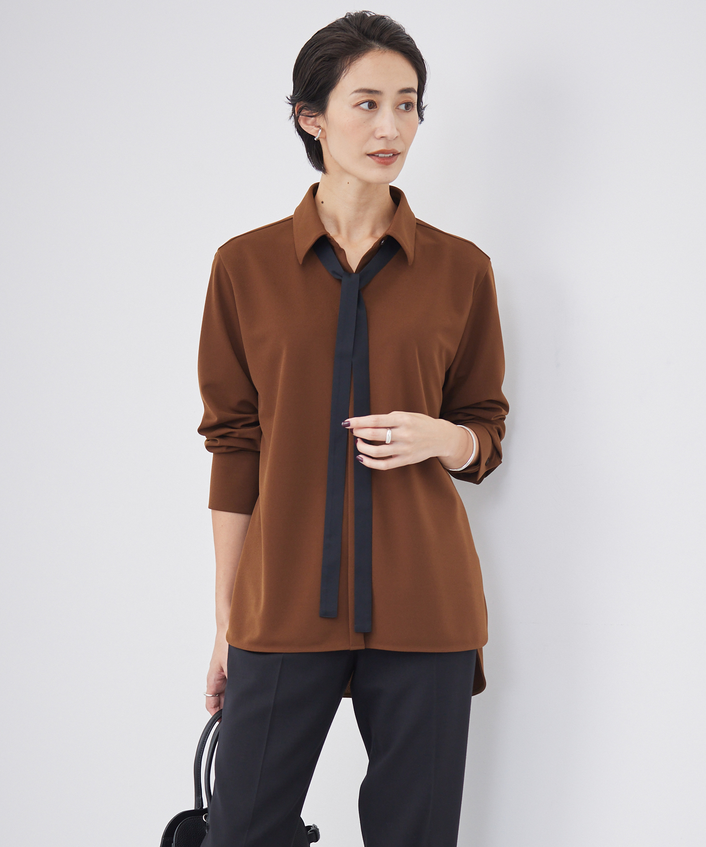 細めのボウタイは取り外しが可能で、リボン結びにしてフェミニンな印象にしたり、ひとからげで長めに垂らしたりと、様々なアレンジをして楽しめるのがポイント。