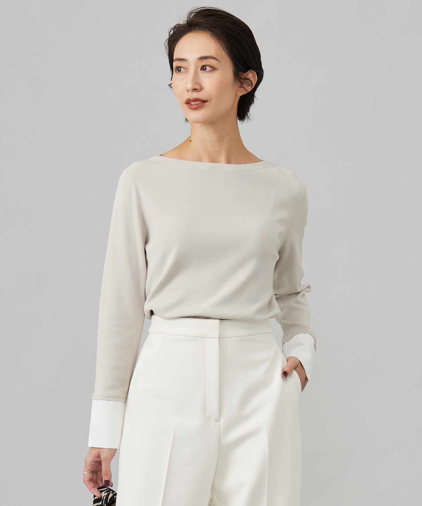 パンツスタイルとの相性は抜群で、タックインしてもタックアウトしても、これ一枚で映えます。