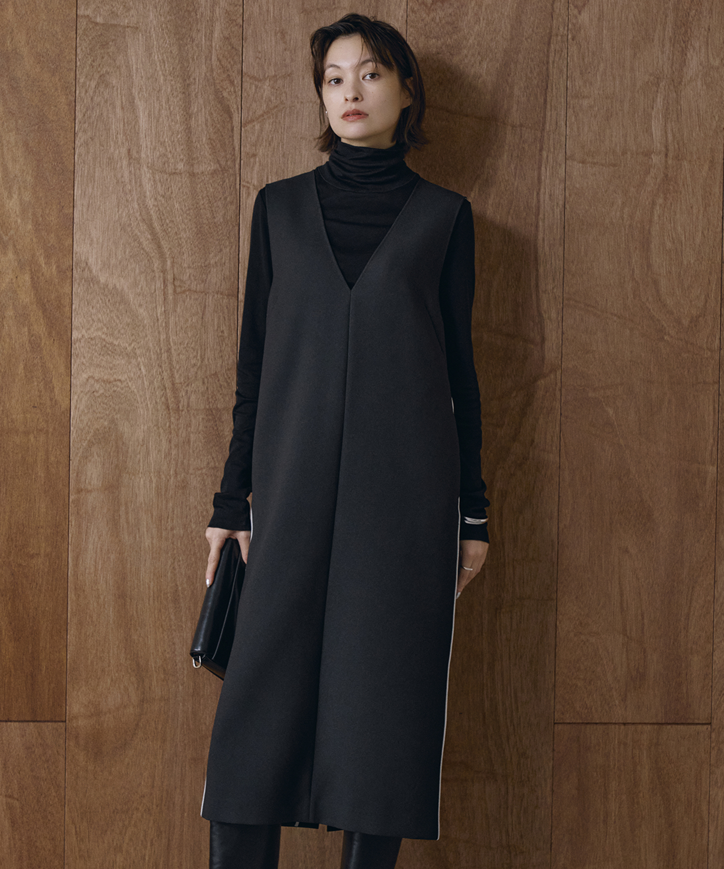 大きく開いたVネックは鎖骨を綺麗に見せつつ全体をシャープに引き締めてくれるので、モードな印象の主役級ワンピースとして活躍してくれます。