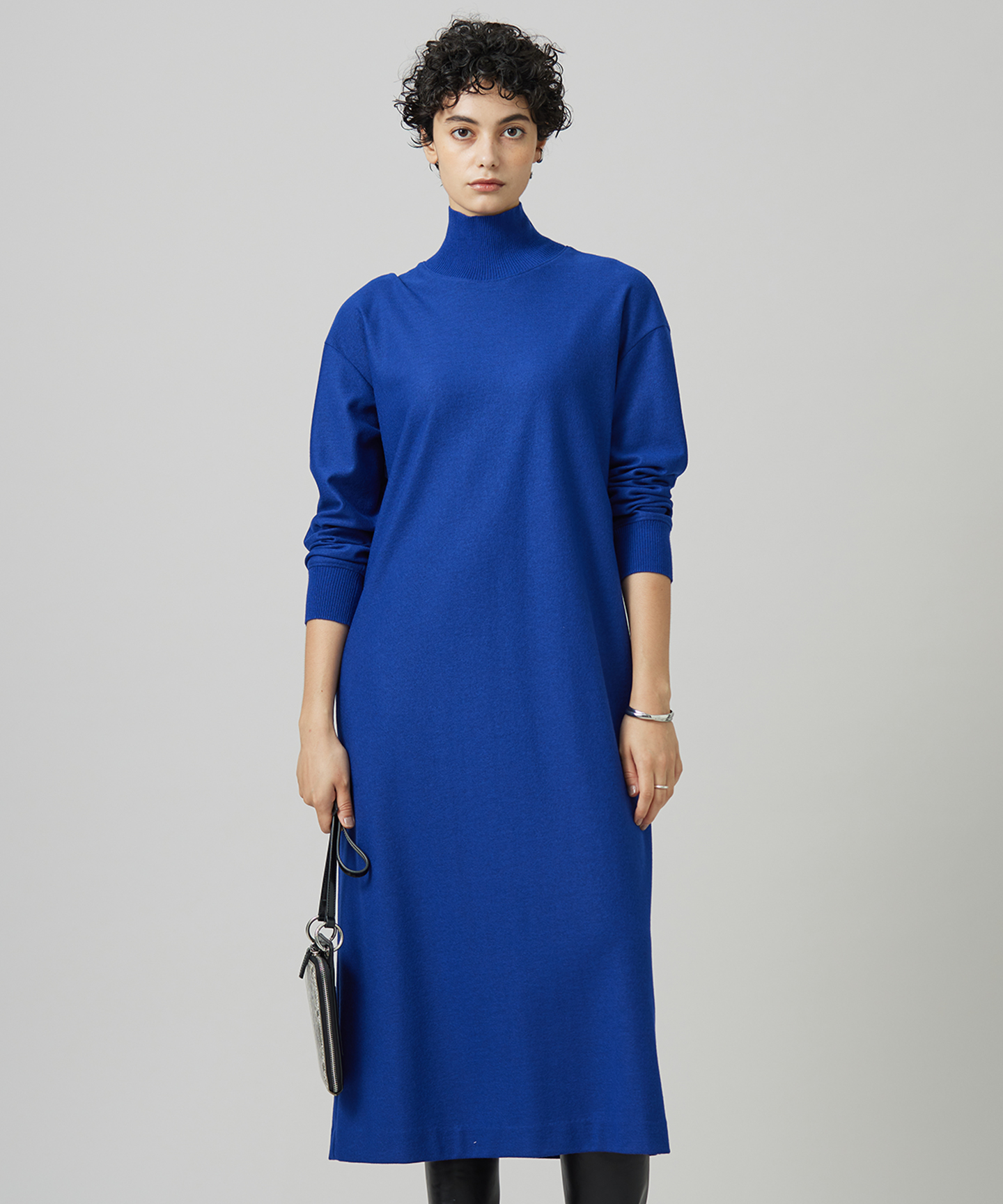 ニットワンピースの袖部分に、ストレートスリーブシャツ風のデザインが施された一枚。